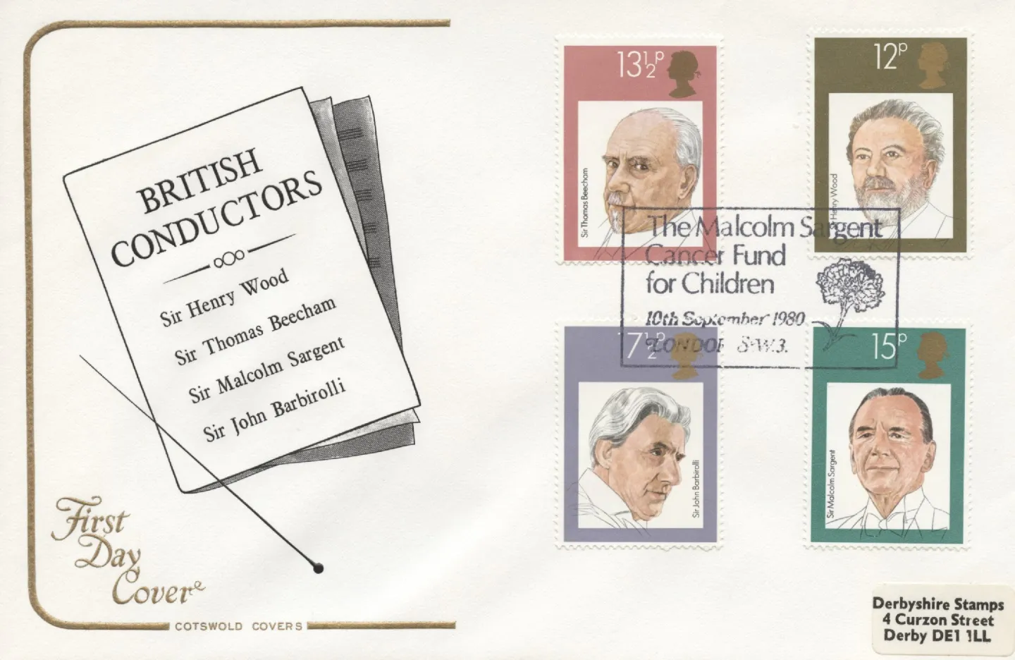 | Stamp Details: | 12p Sir Henry Wood 13 1/2p Sir Thomas Beecham 15p Sir Malcolm Sargent 17.5p Sir John Barbirolli |