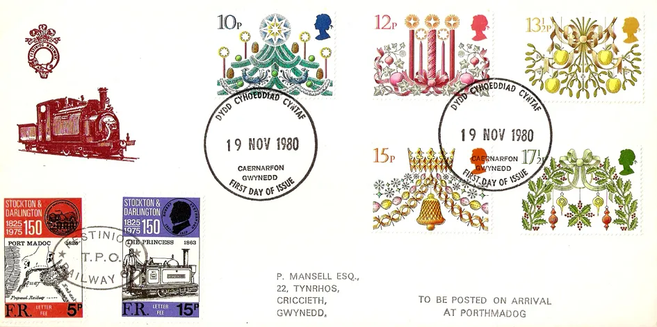 | Stamp Details: | 10p Christmas tree 12p Candles 13 1/2p Apples and mistletoe 15p Crown, chains and bell 17 1/2p Holly |