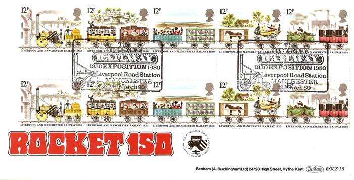 The above Royal Mail Liverpool & Manchester Rly were issued on 12 March 1980 by Royal Mail and feature the following stamp designs: 12p 'The Rocket'; 12p First & Second Class Carriages; 12p Third Class Carriage and Sheep Truck; 12p Horsebox and Carriage Truck; 12p Mail Coach & Goods Truck. The Rocket 150 first day cover with the Manchester, Great Railway Exposition, Special Handstamp postmark has been produced by Benham and features these stamps which can make a very collectible and lovely gift.