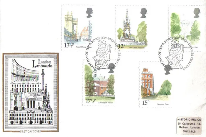 | Stamp Details: | 10 1/2p Buckingham Palace 12p Albert Memorial 13 1/2p Royal Opera House 15p Hampton Court 17 1/2p Kensington Palace |