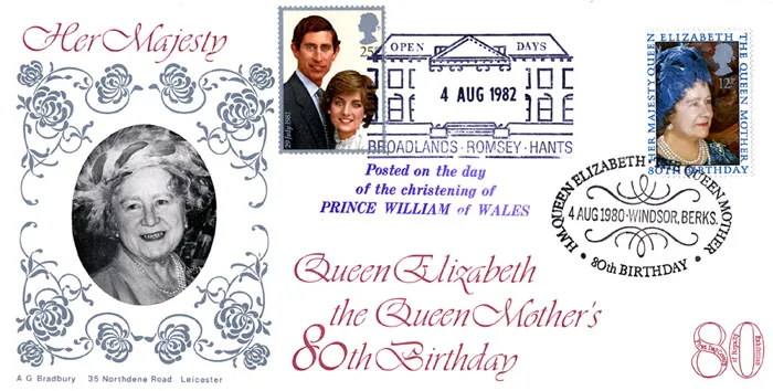 The above Royal Mail Queen Mother 80th Birthday were issued on 04 August 1980 by Royal Mail and feature the following stamp designs: 12p The Queen Mother. The Double Dated Cover first day cover with the Windsor, 80th Birthday, Special Handstamp postmark has been produced by Bradbury and features these stamps which can make a very collectible and lovely gift.
