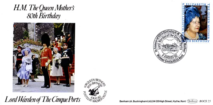 The above Royal Mail Queen Mother 80th Birthday were issued on 04 August 1980 by Royal Mail and feature the following stamp designs: 12p The Queen Mother. The Lord Warden of the Cinque Ports first day cover with the Deal, Deal, Walmer Castle, Special Handstamp, Lord Warden of the Cinque Ports, Special Handstamp postmark has been produced by Benham and features these stamps which can make a very collectible and lovely gift.