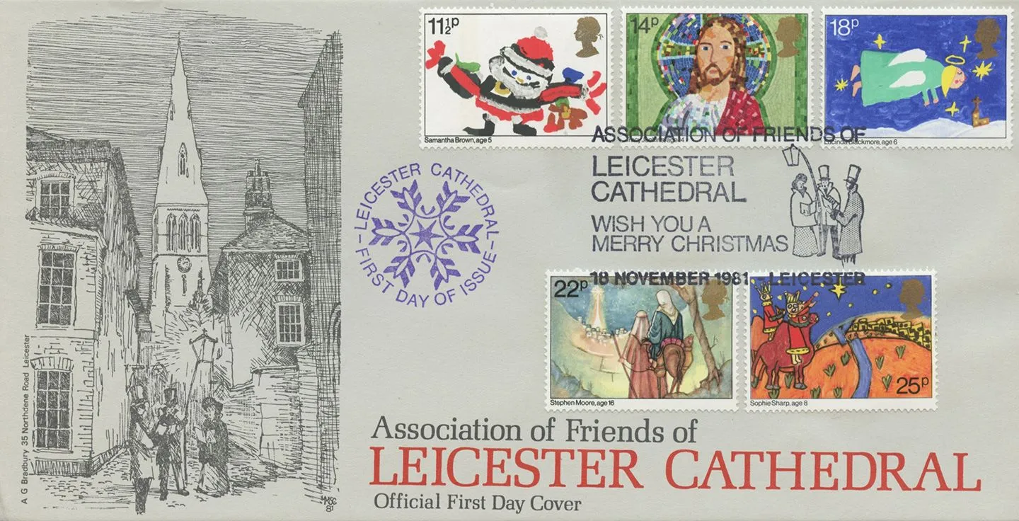 The above Royal Mail Christmas 1981 were issued on 18 November 1981 by Royal Mail and feature the following stamp designs: 11 1/2p Father Christmas; 14p Jesus; 18p Angel; 22p Joseph and Mary; 25p Three Kings. The Leicester Cathedral first day cover with the Leicester, Carol Singers, Special Handstamp postmark has been produced by Bradbury and features these stamps which can make a very collectible and lovely gift.
