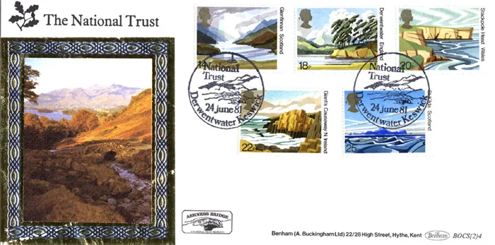 The above Royal Mail National Trusts were issued on 24 June 1981 by Royal Mail and feature the following stamp designs: 14p Glenfinnan; 18p Derwentwater; 20p Stackpole Head; 22p Giant's Causeway; 25p St. Kilda. The The Lake District first day cover with the Keswick, Derwentwater, Special Handstamp postmark has been produced by Benham and features these stamps which can make a very collectible and lovely gift.
