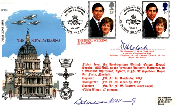 The above Royal Mail Royal Wedding 1981 were issued on 22 July 1981 by Royal Mail and feature the following stamp designs: 14p, 25p Portrait of Charles & Diana. The St Paul's Cathedral first day cover with the BFPS - Forces, Special Handstamp postmark has been produced by Forces and features these stamps which can make a very collectible and lovely gift.