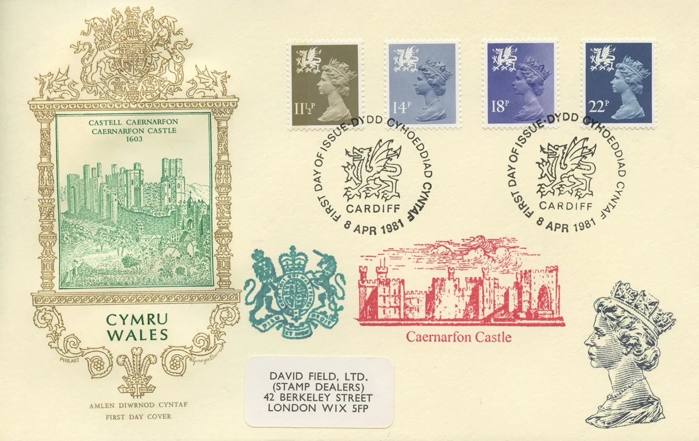 The above Royal Mail Wales 11 1/2p, 14p, 18p, 22p were issued on 08 April 1981 by Royal Mail and feature the following stamp designs: . The Caernarvon Castle first day cover with the Cardiff, First Day of Issue - Welsh Dragon, Special Handstamp postmark has been produced by Philart and features these stamps which can make a very collectible and lovely gift.
