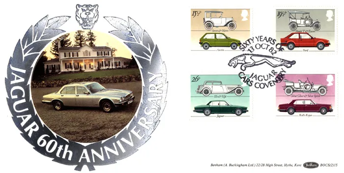 The above Royal Mail British Motor Cars were issued on 13 October 1982 by Royal Mail and feature the following stamp designs: 15 1/2p Metro/Austin 7; 19 1/2p Escort/Model T; 26p Jaguar XJ6/SS1; 29p RR Silver Spirit/Silver Ghost. The Jaguar 60th Anniversary first day cover with the Coventry, Jaguar emblem, Special Handstamp postmark has been produced by Benham and features these stamps which can make a very collectible and lovely gift.