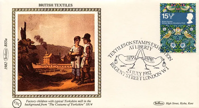 The above Royal Mail British Textiles were issued on 23 July 1982 by Royal Mail and feature the following stamp designs: 15 1/2p Strawberry Thief; 19 1/2p Scarlet Tulips; 26p Cherry Orchard; 29p Chevrons. The Factory Children and Yorkshire Mill first day cover with the London W1, Birds with Strawberries, Special Handstamp postmark has been produced by Benham and features these stamps which can make a very collectible and lovely gift.