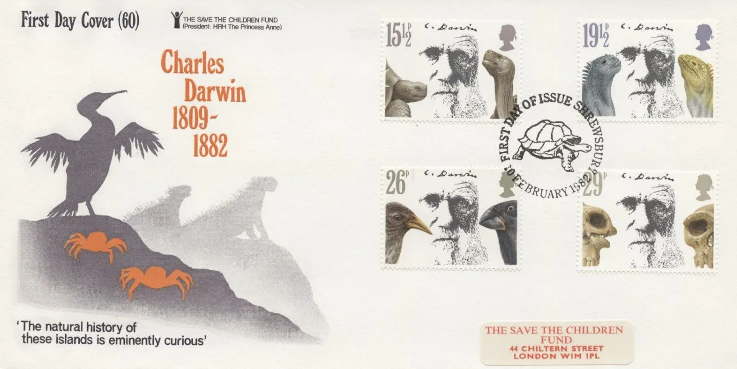 The above Royal Mail Charles Darwin were issued on 10 February 1982 by Royal Mail and feature the following stamp designs: 15 1/2p Giant Tortoises; 19 1/2p Iguanas; 26p Finch; 29p Skulls. The Save the Children Fund first day cover with the Shrewsbury, Special Handstamp postmark has been produced by Philart and features these stamps which can make a very collectible and lovely gift.