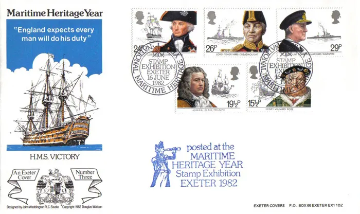 | Stamp Details: | 15 1/2p Henry VIII and Mary Rose 19 1/2p Blake and Triumph 24p Nelson and Victory 26p Fisher and Dreadnought 29p Cunningham and Warspite |