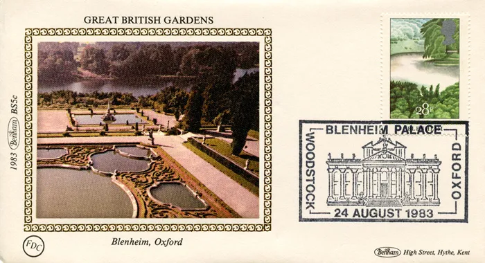 The above Royal Mail British Gardens were issued on 24 August 1983 by Royal Mail and feature the following stamp designs: 16p Sissinghurst; 20 1/2p Biddulph Grange; 28p Blenheim; 31p Pitmedden. The Blenheim Palace first day cover with the Woodstock, Blenheim Palace, Special Handstamp postmark has been produced by Benham and features these stamps which can make a very collectible and lovely gift.