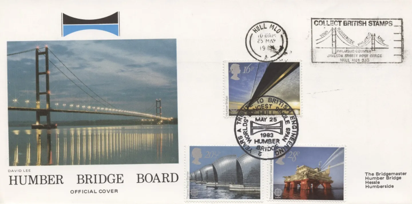 | Postmark: | Hull, Hessle, Barton on Humber, World's Longest Single Span, Special Handstamp, Philatelic Counter (Humber Bridge), Slogan Postmark, North side of the Humber Bridge, CDS Postmark, South side of Humber Bridge, CDS Postmark |