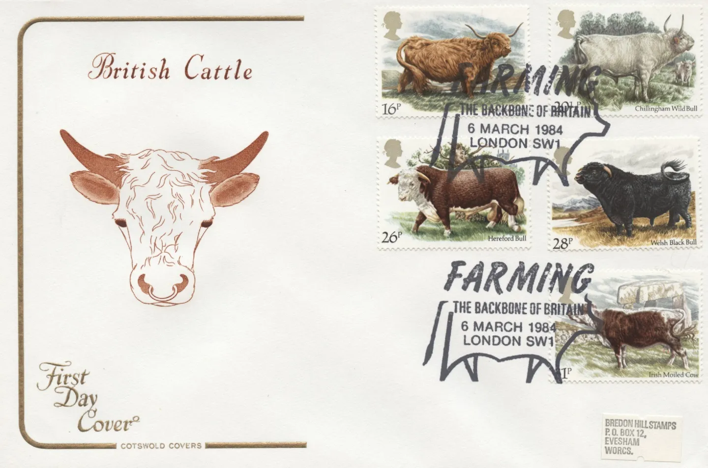 | Postmark: | BFPS - Forces, London, Chillingham, Hereford, Oban, Caernarfon, Philatelic Bureau, London SW1, Earl's Court, Ballynahinch, Cowplain, Rickmansworth, RAF Hereford, Special Handstamp, Stampex, Special Handstamp, Home of the Wild Cattle, Special Handstamp, Last Stronghold of the Wild Cattle, Special Handstamp, Herd Book Society, Special Handstamp, Highland Cattle - First Day of Issue, Special Handstamp, Welsh Black Cattle Society, Special Handstamp, The Royal Veterinary College, Special Handstamp, Agricultural Show - First Day of Issue, Special Handstamp, Farming - The Backbone of Britain, Special Handstamp, The Royal Smithfield Show, Special Handstamp, Irish Moiled Cattle Society, Special Handstamp, CDS Postmark, Friesian Cattle Society, Special Handstamp |