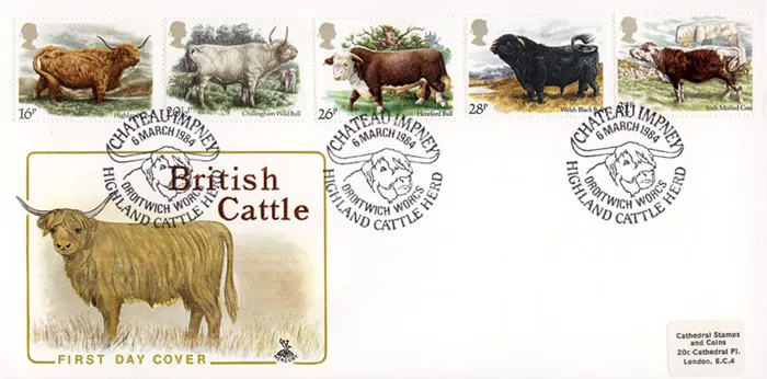 | Stamp Details: | 16p Highland Cow 20 1/2p Chillingham Wild Bull 26p Hereford Bull 28p Welsh Black 31p Irish Moiled Cow |