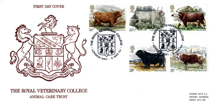 | Stamp Details: | 16p Highland Cow 20 1/2p Chillingham Wild Bull 26p Hereford Bull 28p Welsh Black 31p Irish Moiled Cow |