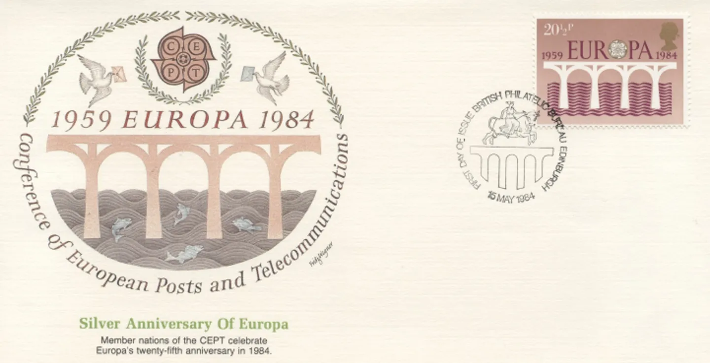 | Stamp Details: | 2 x 16p, 2 x 20 1/2p CEPT 25th Anniversary logo and the Abduction of Europa |