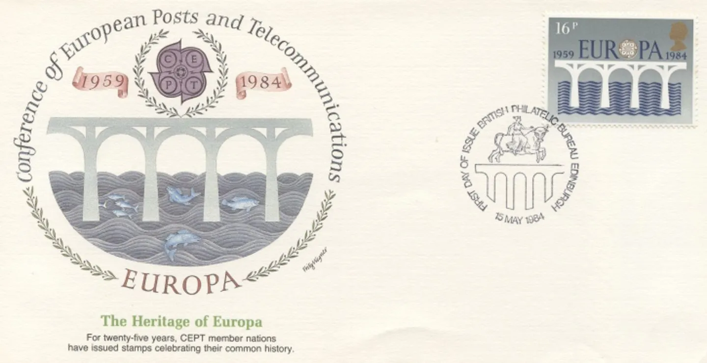 | Stamp Details: | 2 x 16p, 2 x 20 1/2p CEPT 25th Anniversary logo and the Abduction of Europa |