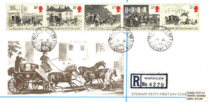 | Stamp Details: | 16p Bath Mail Coach 16p Attack on Exeter Mail Coach 16p Norwich Mail Coach in Thunder Storm 16p Holyhead and Liverpool Mails 16p Edinburgh Mail Snowbound. |