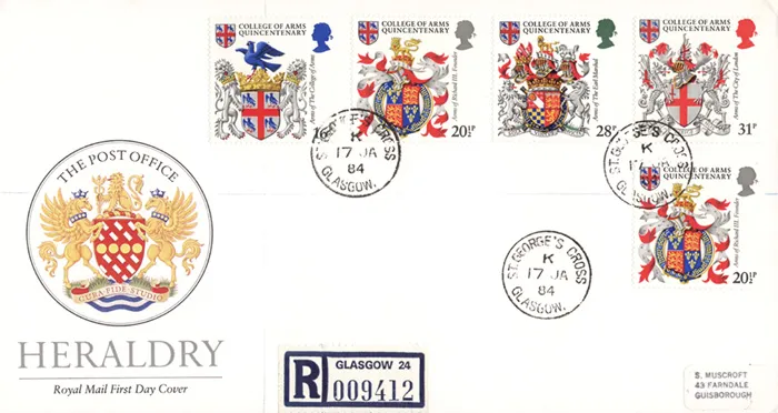 | Postmark: | St. George's Cross, Globe Road, Market Bosworth, Sloane Square, House of Lords, Ludgate Circus, Queen Elizabeth Ave, Buckingham Palace, Fleur-de-Lis, House of Commons, Arundel, CDS Postmark, College of Arms, CDS Postmark, One of the oldest Heraldic symbols, CDS Postmark, Home of the Earl Marshal - 28p, CDS Postmark |