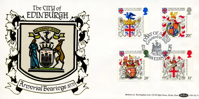 The above Royal Mail Heraldry were issued on 17 January 1984 by Royal Mail and feature the following stamp designs: 16p College of Arms; 20 1/2p Richard III; 28p The Earl Marshal; 31p City of London. The The City of Edinburgh first day cover with the Edinburgh, Coat of Arms, Special Handstamp postmark has been produced by Benham and features these stamps which can make a very collectible and lovely gift.