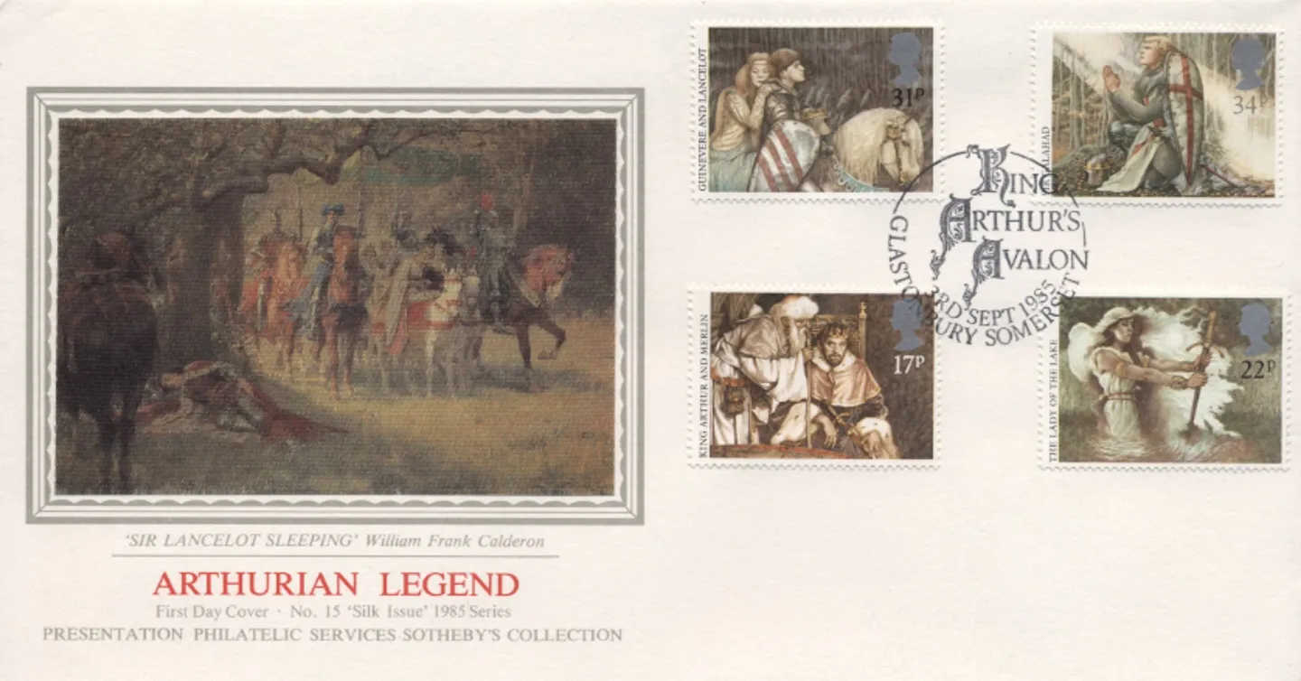 The above Royal Mail Arthurian Legend were issued on 03 September 1985 by Royal Mail and feature the following stamp designs: 17p Arthur and Merlin; 22p Lady of the Lake; 31p Guinevere and Lancelot; 34p Sir Galahad. The Sir Lancelot Sleeping first day cover with the Glastonbury, Winchester, Warminster, Winchester, Lancelot Place, Glastonbury, Winchester, Tintagel, Tintagel, Glastonbury, Various, House of Commons, House of Lords, Winchester, St. Paul's, Knight's Road, London SW1, Celtic Legend, Special Handstamp, Great Hall, Special Handstamp, Morte d'Arthur, Special Handstamp, CDS Postmark, CDS Postmark, King Arthur's Avalon, Special Handstamp, CDS Postmark, Crown, Special Handstamp, Old Post Office, Special Handstamp, Isle of Avalon, CDS Postmark, (with Cadbury Castle cachet), CDS Postmark, with Tennyson cachet, CDS Postmark, The Legendary Camelot, Special Handstamp, The Sword and the Stone, Special Handstamp, CDS Postmark, Caxton's Printing of Mort D'Arthur, Special Handstamp postmark has been produced by Pres. Philatelic Services and features these stamps which can make a very collectible and lovely gift.