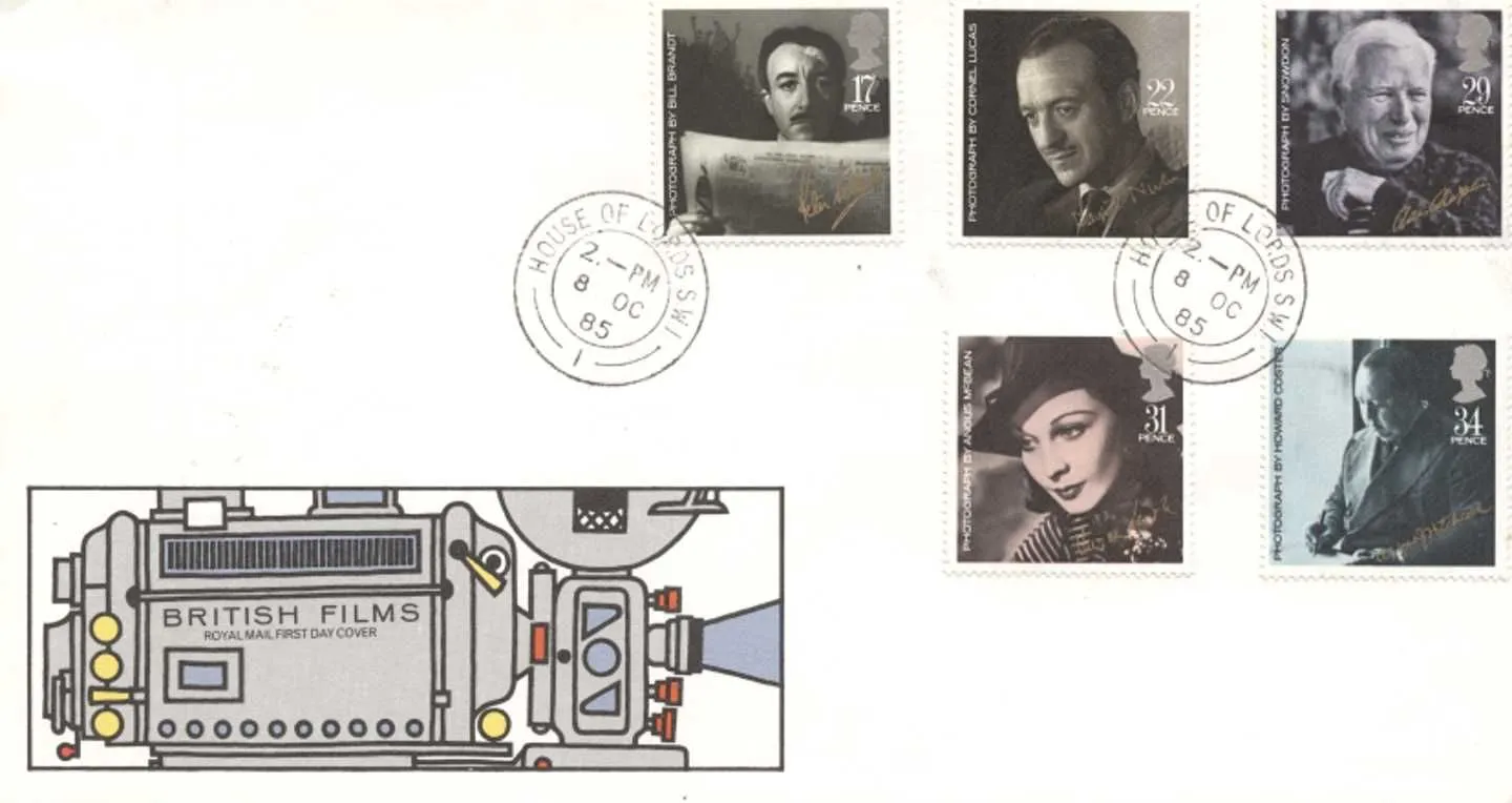 | Postmark: | Shepperton, Sloane Square, Kirriemuir, Victoria, Walworth, Leytonstone, Castle Rd, Southsea, House of Lords, Hollywood, CDS Postmark, Vivien Leigh, CDS Postmark, home of David Niven, CDS Postmark, Birthplace of David Niven, CDS Postmark, Birthplace of Charlie Chaplin, CDS Postmark, Birthplace of Alfred Hitchcock, CDS Postmark, Birthplace of Peter Sellars, CDS Postmark |