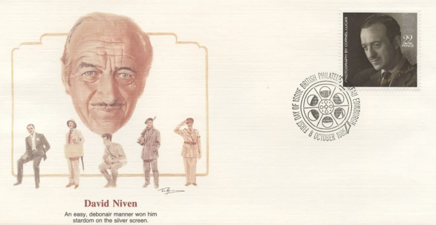 | Stamp Details: | 17p Peter Sellers 22p David Niven 29p Charles Chaplin 31p Vivien Leigh 34p Alfred Hitchcock |