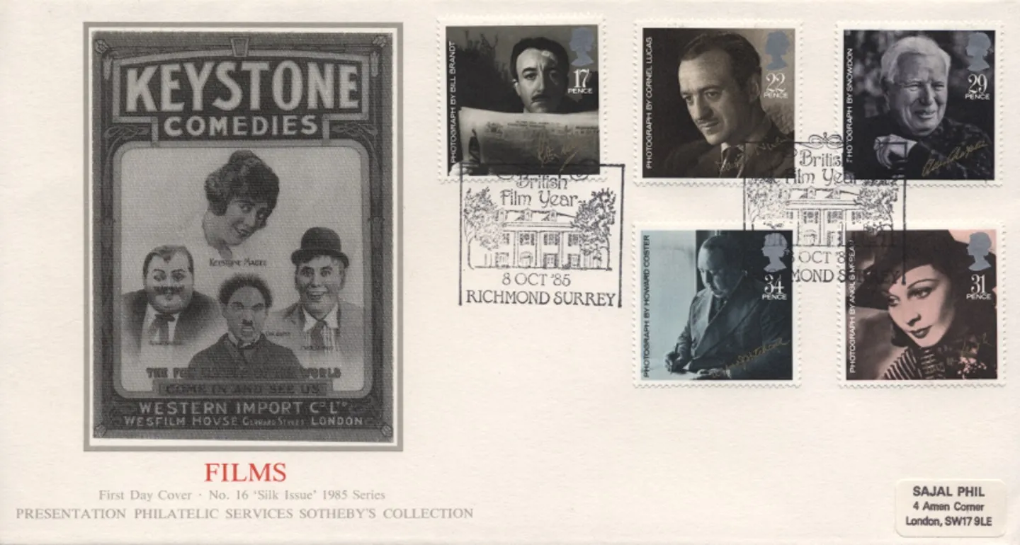 | Postmark: | National Postal Museum, London, London W1, London WC, Northampton, Leicester Square, Bradford, Leytonstone, Richmond, Special Handstamp, National Film Archive, Special Handstamp, Equity, Special Handstamp, British Film Year MCMLXXXV - Torch, Special Handstamp, Leicester Square - Cinema Audience, Special Handstamp, Goldcrest British Film Year, Special Handstamp, David Niven - Campaign for Motor Neurone Disease, Special Handstamp, Pink Panther, Special Handstamp, British Film Year, Special Handstamp, Sir Alfred Hitchcock Hotel, Special Handstamp |