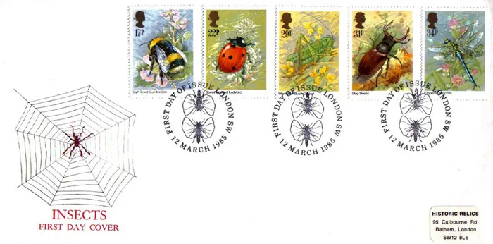 | Stamp Details: | 17p Bumble Bee 22p Ladybird 29p Bush Cricket 31p Stag Beetle 34p Dragonfly |