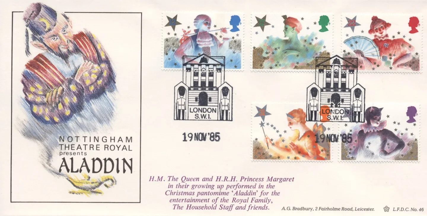 The above Royal Mail Christmas 1985 were issued on 19 November 1985 by Royal Mail and feature the following stamp designs: 12p Principal Boy; 17p Genie; 22p Dame; 31p Fairy; 34p Pantomime Cat. The Aladdin first day cover with the Nottingham, Bethlehem, Nottingham, London SW1, Philatelic Bureau, Bethlehem, Bethlehem, Theatre Royal Presents Aladdin, Special Handstamp, CDS Postmark, Theatre Royal Presents Aladdin, Special Handstamp, Buckingham Palace, Special Handstamp, First Day of Issue - Aladdin's Lamp, Special Handstamp, First Day of Issue - Christmas Bells, Special Handstamp, First Day of Issue - Christmas Bells, Special Handstamp postmark has been produced by Bradbury and features these stamps which can make a very collectible and lovely gift.