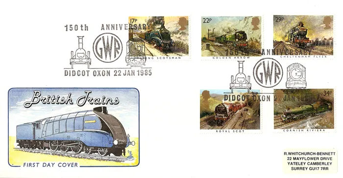| Stamp Details: | 17p Flying Scotsman 22p Golden Arrow 29p Cheltenham Flyer 31p Royal Scot 34p Cornish Riviera |
