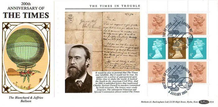 The above Royal Mail PSB: The Times - Pane 3 were issued on 08 January 1985 by Royal Mail and feature the following stamp designs: . The Blanchard & Jeffries Balloon first day cover with the London WC, First Day of Issue - Printing Press, Special Handstamp postmark has been produced by Benham and features these stamps which can make a very collectible and lovely gift.
