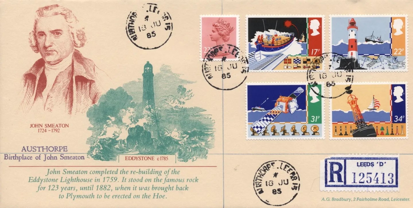 | Postmark: | Lighthouse, Austhorpe, Leeds, Plymouth, CDS Postmark, Birthplace of Smeaton, CDS Postmark, Philatelic Counter, CDS Postmark |