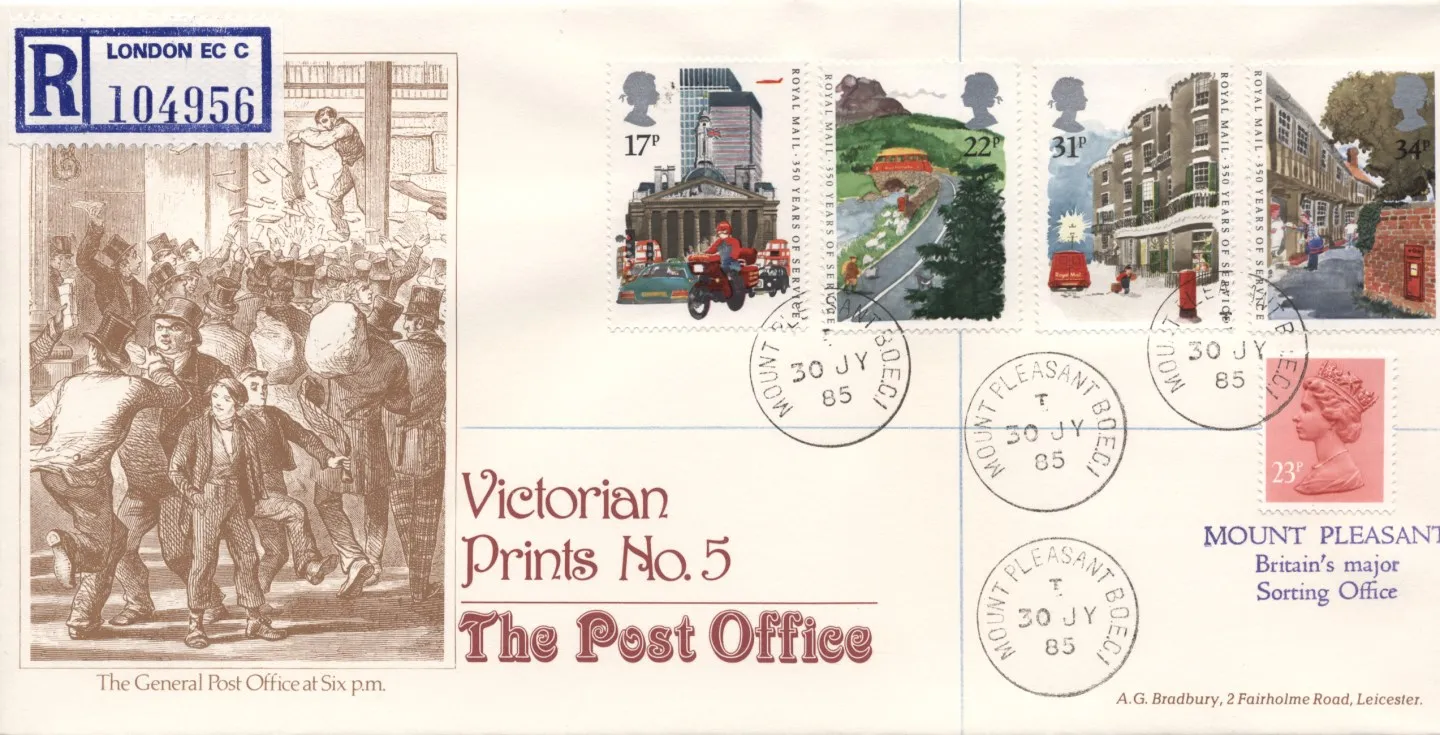 The above Royal Mail The Royal Mail were issued on 30 July 1985 by Royal Mail and feature the following stamp designs: 17p Datapost; 22p Postbus; 31p Parcel Post; 34p Letter Post. The The General Post Office at 6 pm first day cover with the National Postal Museum, Mount Pleasant, Stock Exchange, Special Handstamp, CDS Postmark, CDS Postmark postmark has been produced by Bradbury and features these stamps which can make a very collectible and lovely gift.