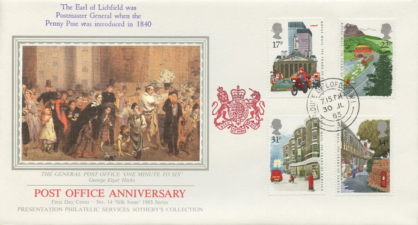 The above Royal Mail The Royal Mail were issued on 30 July 1985 by Royal Mail and feature the following stamp designs: 17p Datapost; 22p Postbus; 31p Parcel Post; 34p Letter Post. The The General Post Office 'One Minute to Six' first day cover with the House of Lords, CDS Postmark postmark has been produced by Pres. Philatelic Services and features these stamps which can make a very collectible and lovely gift.