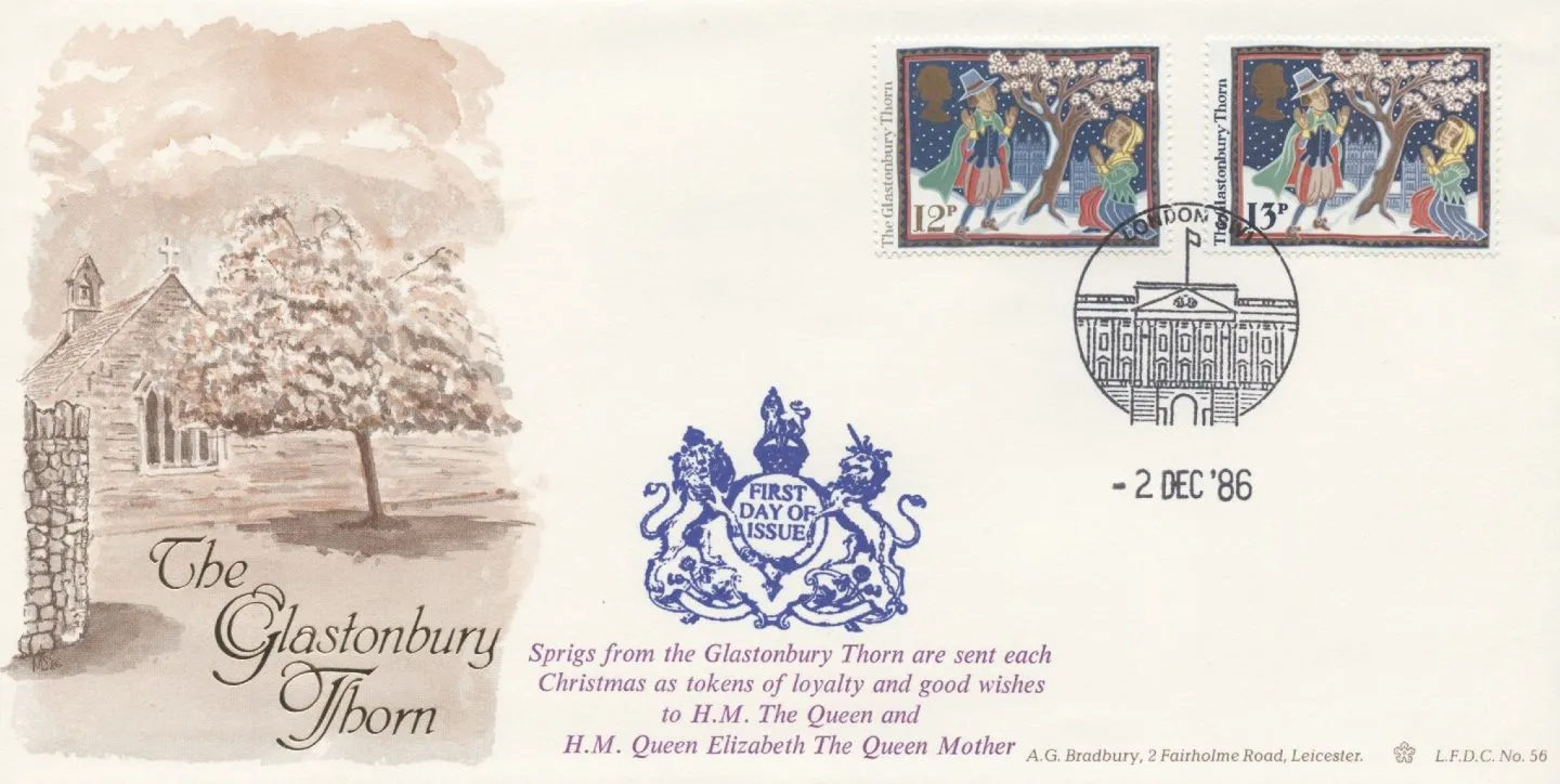 The above Royal Mail Christmas 1986: 12p were issued on 02 December 1986 by Royal Mail and feature the following stamp designs: 12p Glastonbury Thorn. The Church scene first day cover with the London SW1, Special Handstamp postmark has been produced by Bradbury and features these stamps which can make a very collectible and lovely gift.
