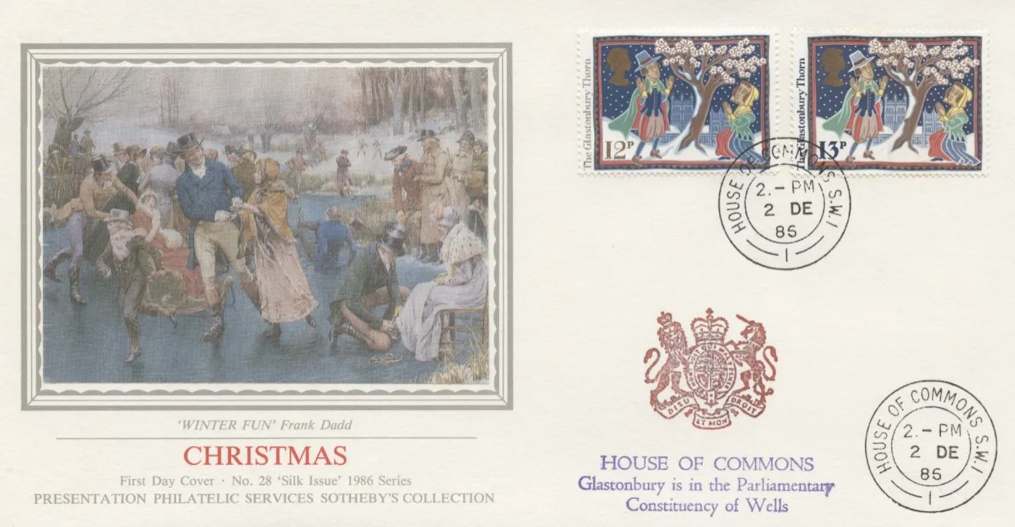 The above Royal Mail Christmas 1986: 12p were issued on 02 December 1986 by Royal Mail and feature the following stamp designs: 12p Glastonbury Thorn. The Winter Fun first day cover with the House of Commons, House of Lords, CDS Postmark, CDS Postmark postmark has been produced by Pres. Philatelic Services and features these stamps which can make a very collectible and lovely gift.