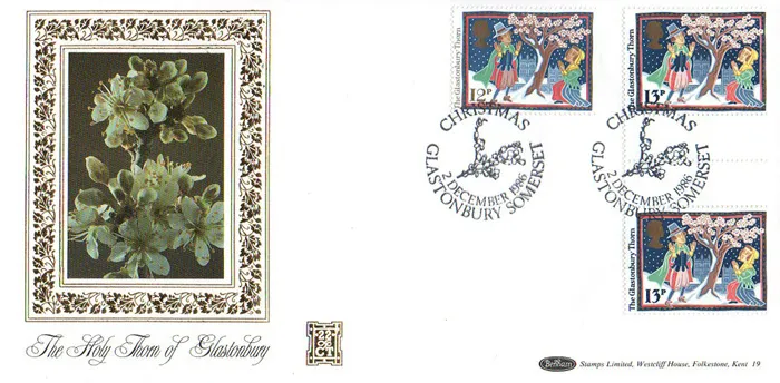 The above Royal Mail Christmas 1986: 12p were issued on 02 December 1986 by Royal Mail and feature the following stamp designs: 12p Glastonbury Thorn. The Glastonbury Thorn first day cover with the Glastonbury, Thorn, Special Handstamp postmark has been produced by Benham and features these stamps which can make a very collectible and lovely gift.