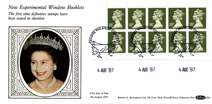 The above Royal Mail Window: Window Design: £1.80 were issued on 04 August 1987 by Royal Mail and feature the following stamp designs: . The H M The Queen first day cover with the Bristol, Clifton Suspension Bridge, Special Handstamp postmark has been produced by Benham and features these stamps which can make a very collectible and lovely gift.
