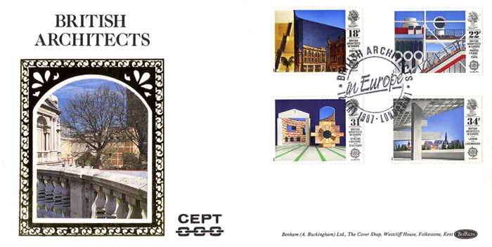 | Stamp Details: | 18p Willis Faber Dumas Blg, Ipswich 22p Pompidou Centre, Paris 31p Staatsgalerie, Stuttgart 34p European Investment Bank, Luxembourg |