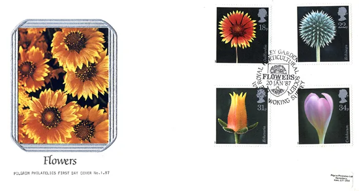 | Stamp Details: | 18p Blanket Flower 22p Globe Thistle 31p Echeveria 34p Autumn Crocus |