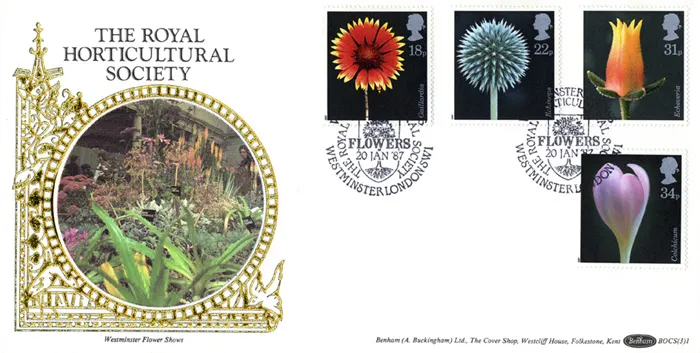 The above Royal Mail Flowers were issued on 20 January 1987 by Royal Mail and feature the following stamp designs: 18p Blanket Flower; 22p Globe Thistle; 31p Echeveria; 34p Autumn Crocus. The Westminster Flower Shows first day cover with the Westminster, Royal Horticultural Society Westminster Shows, Special Handstamp postmark has been produced by Benham and features these stamps which can make a very collectible and lovely gift.