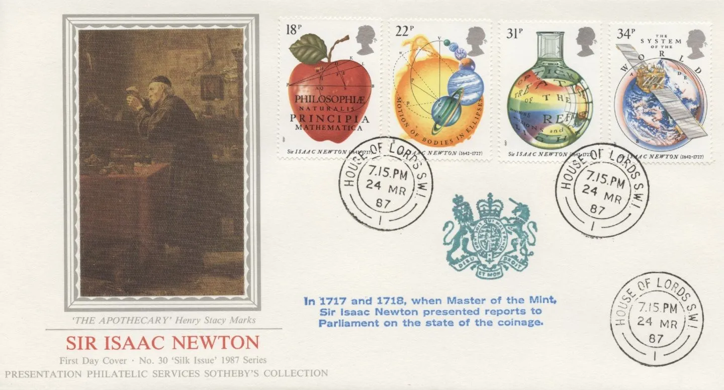 The above Royal Mail Sir Isaac Newton were issued on 24 March 1987 by Royal Mail and feature the following stamp designs: 18p Principia; 22p Motion of Bodies; 31p Opticks; 34p The System of the World. The The Apothecary first day cover with the House of Lords, House of Commons, CDS Postmark, CDS Postmark postmark has been produced by Pres. Philatelic Services and features these stamps which can make a very collectible and lovely gift.