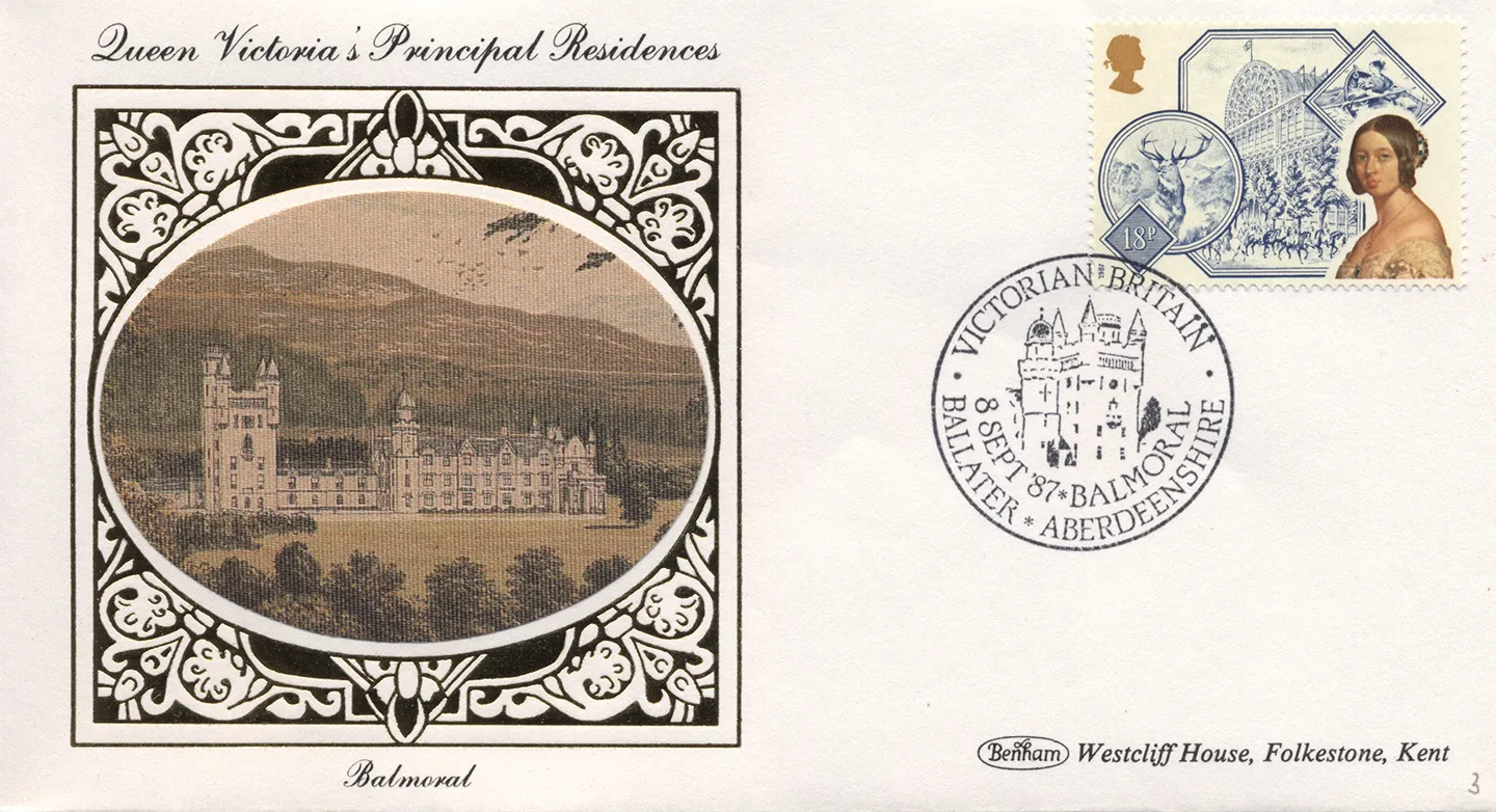 The above Royal Mail Victorian Britain were issued on 08 September 1987 by Royal Mail and feature the following stamp designs: 18p Crystal Palace, Monarch of the Glen and Grace Darling; 22p Great Eastern, Mrs Beeton and Prince Albert; 31p Albert Memorial, Ballot Box and Disraeli; 34p Diamond Jubilee, Relief of Mafeking and Morse Code. The Balmoral first day cover with the Ballater, Balmoral, Special Handstamp postmark has been produced by Benham and features these stamps which can make a very collectible and lovely gift.