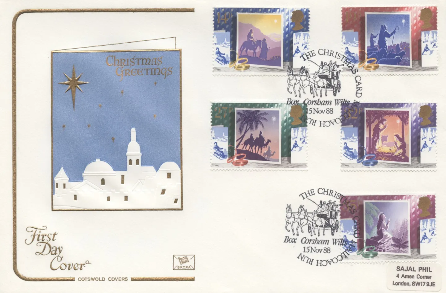 | Stamp Details: | 14p Journey to Bethlehem 19p Shepherds and Star 27p Three Wise Men 32p The Nativity 35p The Annunciation |
