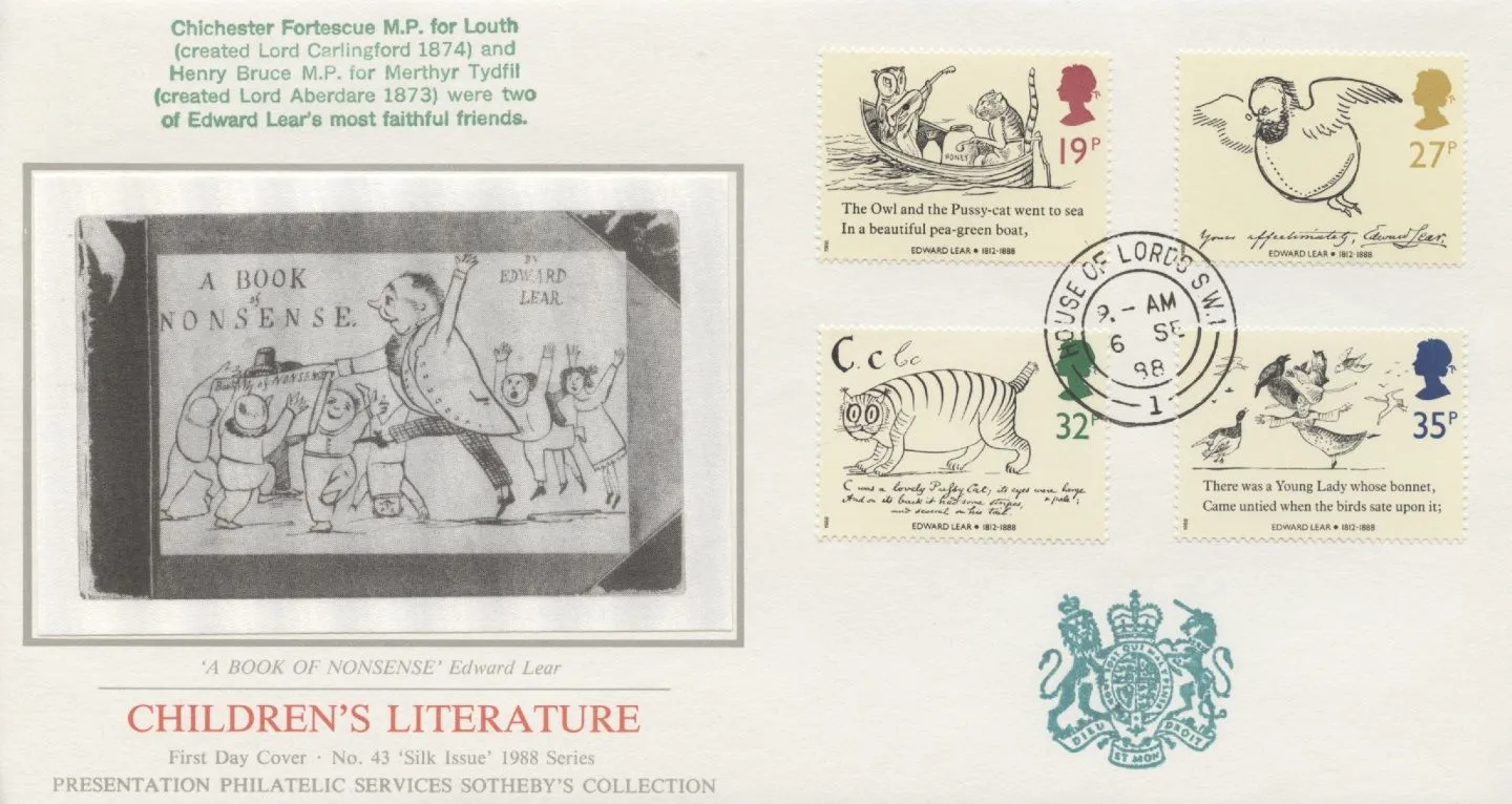 The above Royal Mail Edward Lear: Stamps were issued on 06 September 1988 by Royal Mail and feature the following stamp designs: 19p The Owl and the Pussycat; 27p Pen Sketch; 32p Alphabet 'C'; 35p Rhyme. The A Book of Nonsense first day cover with the House of Lords, House of Commons, CDS Postmark, CDS Postmark postmark has been produced by Pres. Philatelic Services and features these stamps which can make a very collectible and lovely gift.