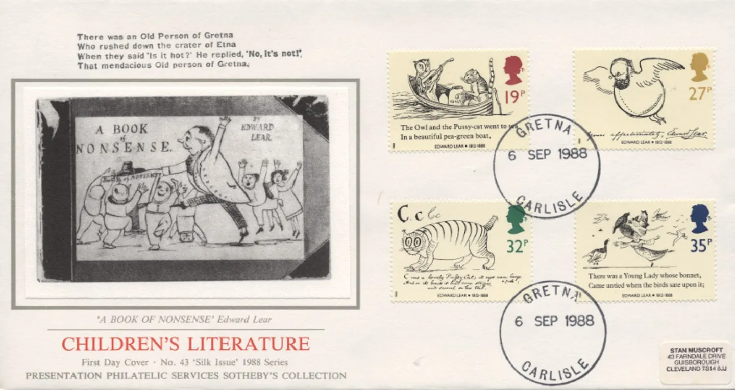 The above Royal Mail Edward Lear: Stamps were issued on 06 September 1988 by Royal Mail and feature the following stamp designs: 19p The Owl and the Pussycat; 27p Pen Sketch; 32p Alphabet 'C'; 35p Rhyme. The A Book of Nonsense first day cover with the Hull, London, Learmouth, London, Holloway, Knowsley, BFPS - Forces, Knowsley, Gretna, Holloway, House of Commons, House of Lords, Schools, Special Handstamp, Coeliac Symposium, Special Handstamp, Special Handstamp, Partners, Special Handstamp, Birthplace of Edward Lear, Special Handstamp, Owl & Pussycat, Special Handstamp, Special Handstamp, CDS Postmark, CDS Postmark, Birthplace of Edward Lear, CDS Postmark, (with special cachet), CDS Postmark, (with special cachet), CDS Postmark postmark has been produced by Pres. Philatelic Services and features these stamps which can make a very collectible and lovely gift.