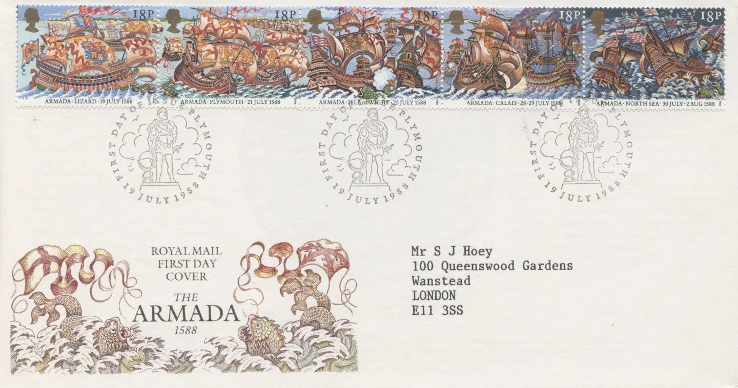 | Postmark: | Tavistock, Plymouth, Philatelic Bureau, Tilbury, Pitlochry, BFPS - Forces, Effingham, Chester, Armada Anniversary, Special Handstamp, Tudor Rose, Special Handstamp, First Day of Issue - Statue of Francis Drake, Special Handstamp, Spanish Galleon, Special Handstamp, First Day of Issue - Fish, Special Handstamp, Scout Camp Blair Atholl, Special Handstamp, The Royal Tournament, Special Handstamp, Galleon, Special Handstamp, John Hurleston - Mariner, Special Handstamp |