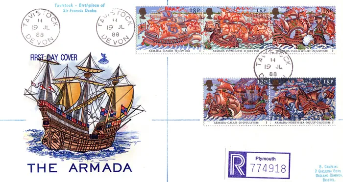 | Postmark: | Tavistock, Plymouth, Birthplace of Sir Francis Drake, CDS Postmark, Galleon - rectangular, Special Handstamp |