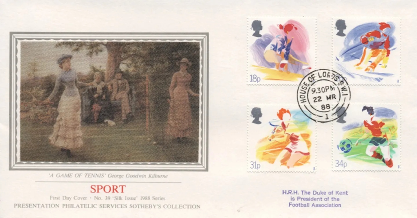 The above Royal Mail Sports Organisations were issued on 22 March 1988 by Royal Mail and feature the following stamp designs: 18p Gymnastics; 26p Skiing; 31p Lawn Tennis; 34p Association Football. The A Game of Tennis first day cover with the London, Slough, Manchester, Leamington Spa, Wimbledon, House of Commons, House of Lords, Edgbaston, Lawn Tennis, Special Handstamp, Gymnastics, Special Handstamp, Question of Sport, Special Handstamp, First Lawn Tennis Club, CDS Postmark, Lawn Tennis, CDS Postmark, CDS Postmark, CDS Postmark, Lawn Tennis - 130th Anniversary, Special Handstamp postmark has been produced by Pres. Philatelic Services and features these stamps which can make a very collectible and lovely gift.